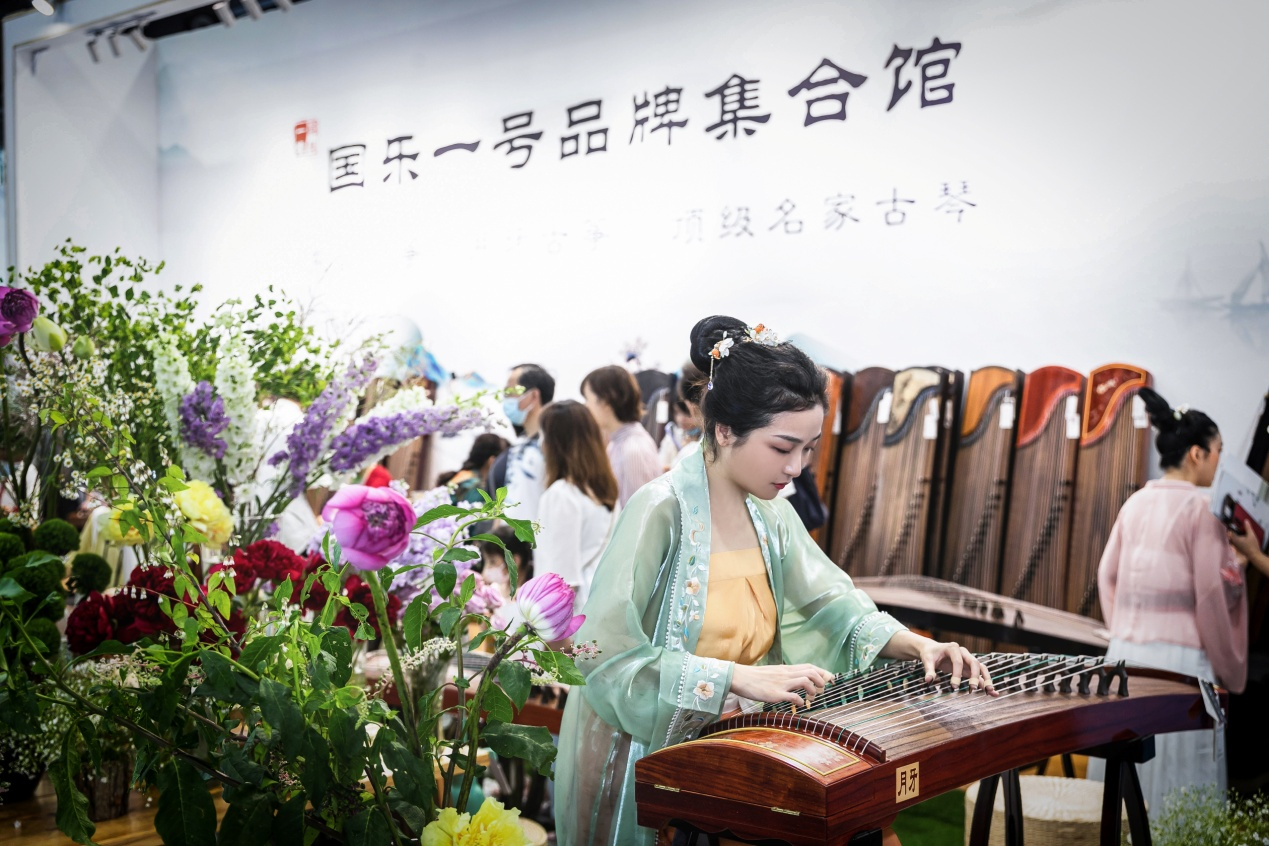 走近展位,咋一看以为错进了花卉展,各式各样的好看的鲜花,以一种恰到好处的排列方式呈现,与展位形成一个整体,置身其中,古筝与鲜花的巧妙结合,这种展示让人更加赏心悦目,忍不住驻足,停留下来一起拍个照,美好的事物总是会相互吸引。