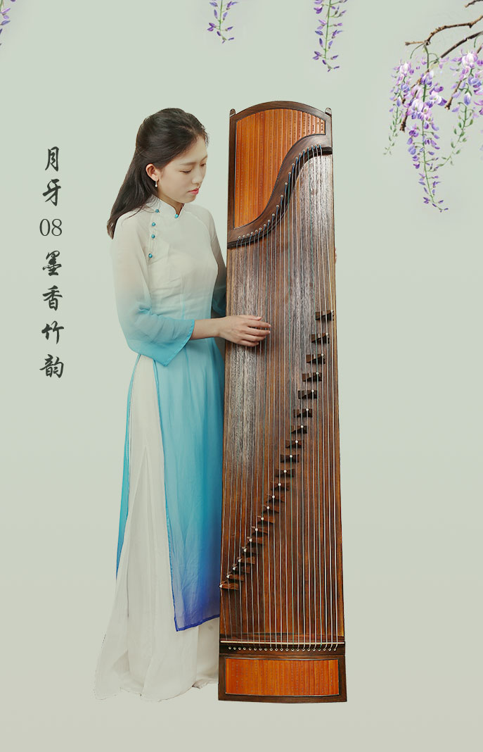 月牙古筝:月牙古筝属纯手工、实木古筝(非厂琴),专注精品,制作苛刻,每台琴都经斫琴师亲自选材、斫制;追求品质,不求速度,制作周期高于市面常规古筝,故产量很低,名气更是鲜为人知,一般仅限于行内的一些“琴痴”手头流传,也正映衬了那句话——“好琴不知世,只为知音人。”。